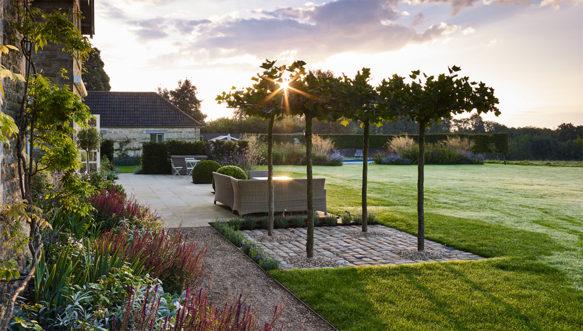 Designed by garden designer Rachel Garrood the grounds of the Cotswold country house had been extensively redesigned. The project comprised of Cotswold stone walling, new sawn York stone terraces, metal edging welded on site, cobble paths, hoggin paths, extensive topiary, planting, a lighting scheme design and ducting and a design of the automatic irrigation system.